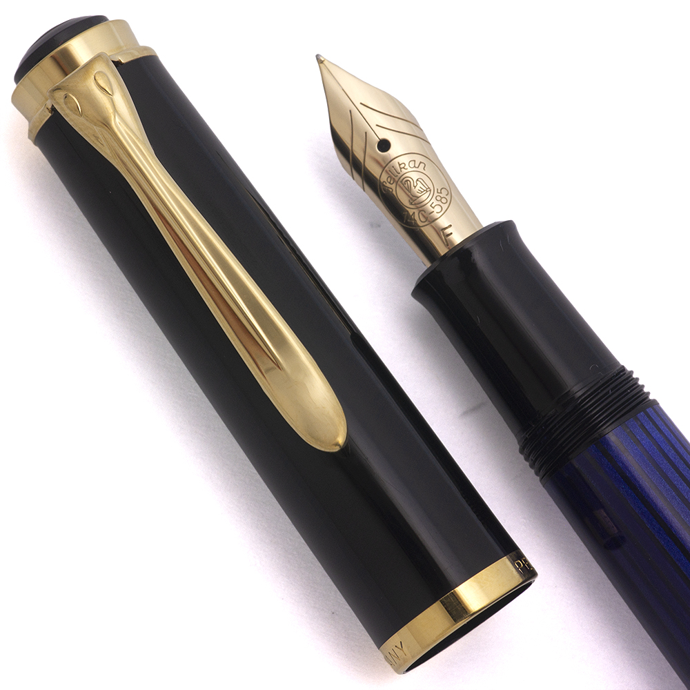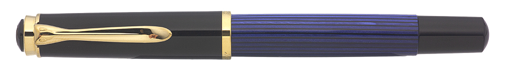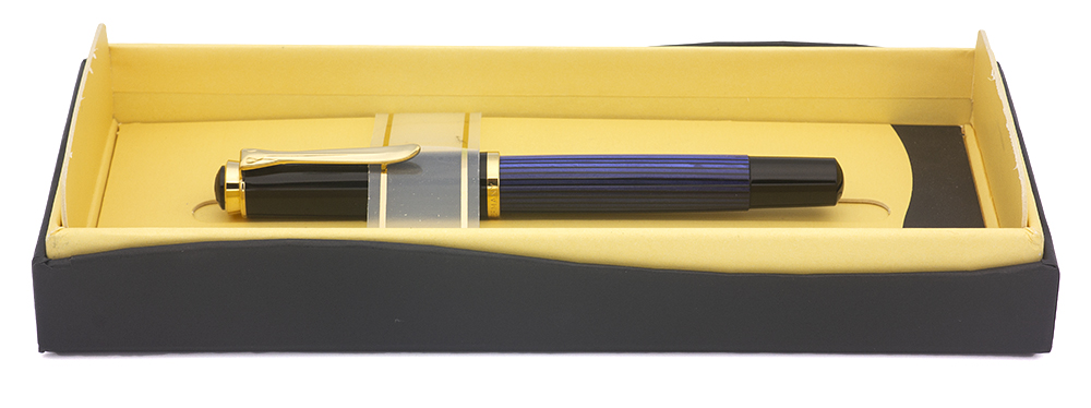 Condition Excellent + condition, with only very light wear on the body and cap visible under magnification. There are small scratches on the binde. The section and piston knob look great. The cap has some very light scratching (mostly along the bottom inch or so, which makes us think that the strap in the box contributed to this). The clip has microscratching on the edges, and the gold trim at the top of the cap looks great. The pelican logo on top of the cap is crisp and clear, with all paint intact. The cap band has light scratching. In hand, the pen looks beautiful and shiny. The filling system works very nicely and the transparency is great. Ships in original Pelikan box.