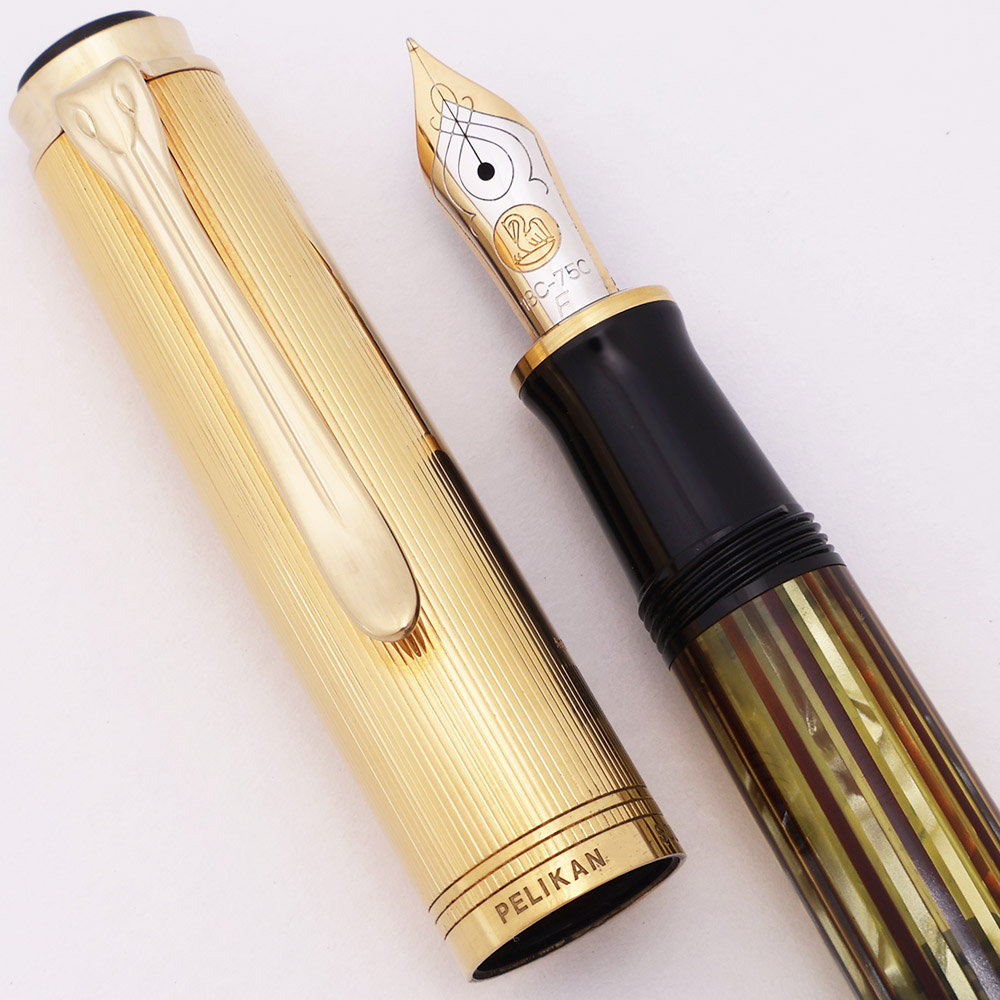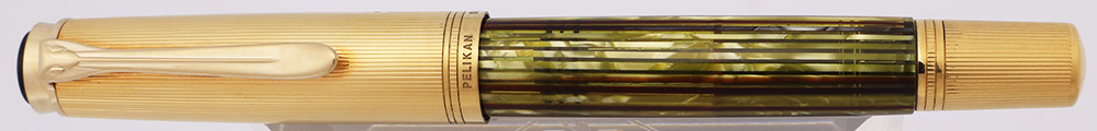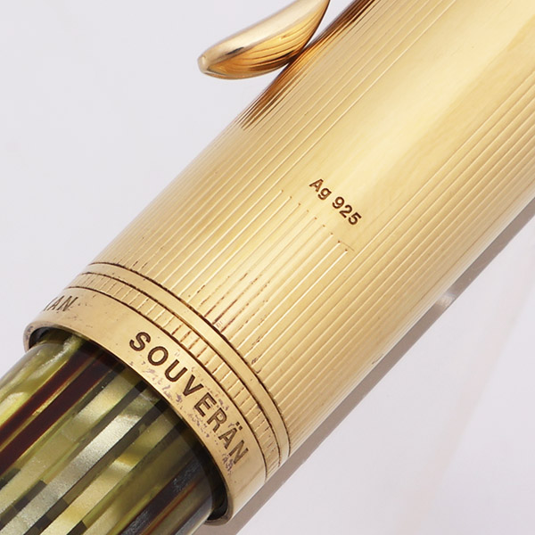 Color Tortoiseshell barrel, with vermeil cap and piston knob with lengthwise lines. The cap is hallmarked, and the original brochure indicates that both cap and piston knob are gold-plated sterling silver, or vermeil. This is the "light tortoiseshell" - in some places it's referred to as Light Green Tortoise.