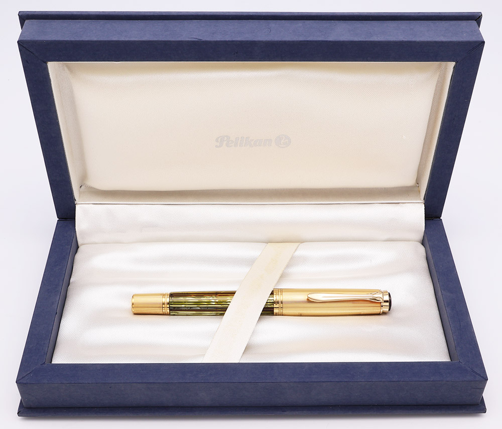 Condition Excellent + condition, in box, with paperwork. This is a gorgeous, elegant, and highly desirable pen. The barrel has some microscratching that is difficult to see because of the patterning. The cap is vermeil (gold over sterling silver) with some microscratching and light polishing marks. There is some patina peeking through on the cap lip. The trim ring nearest the nib has some brassing. The guilloche patterning on the cap looks great. The barrel transparency is fantastic. The imprints and "Ag925" on the cap are clear. Ships in original box with paperwork, as well as outer cardboard box specifying the model.