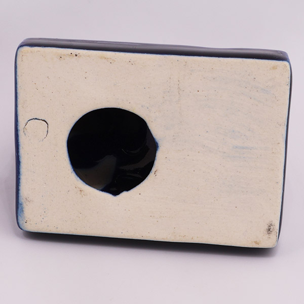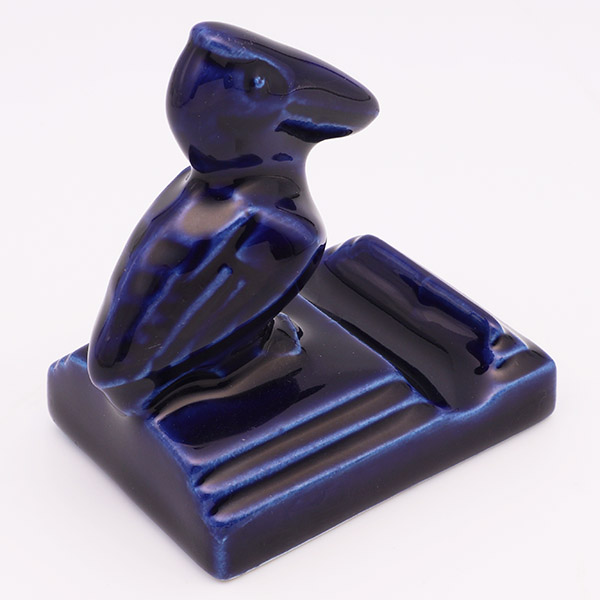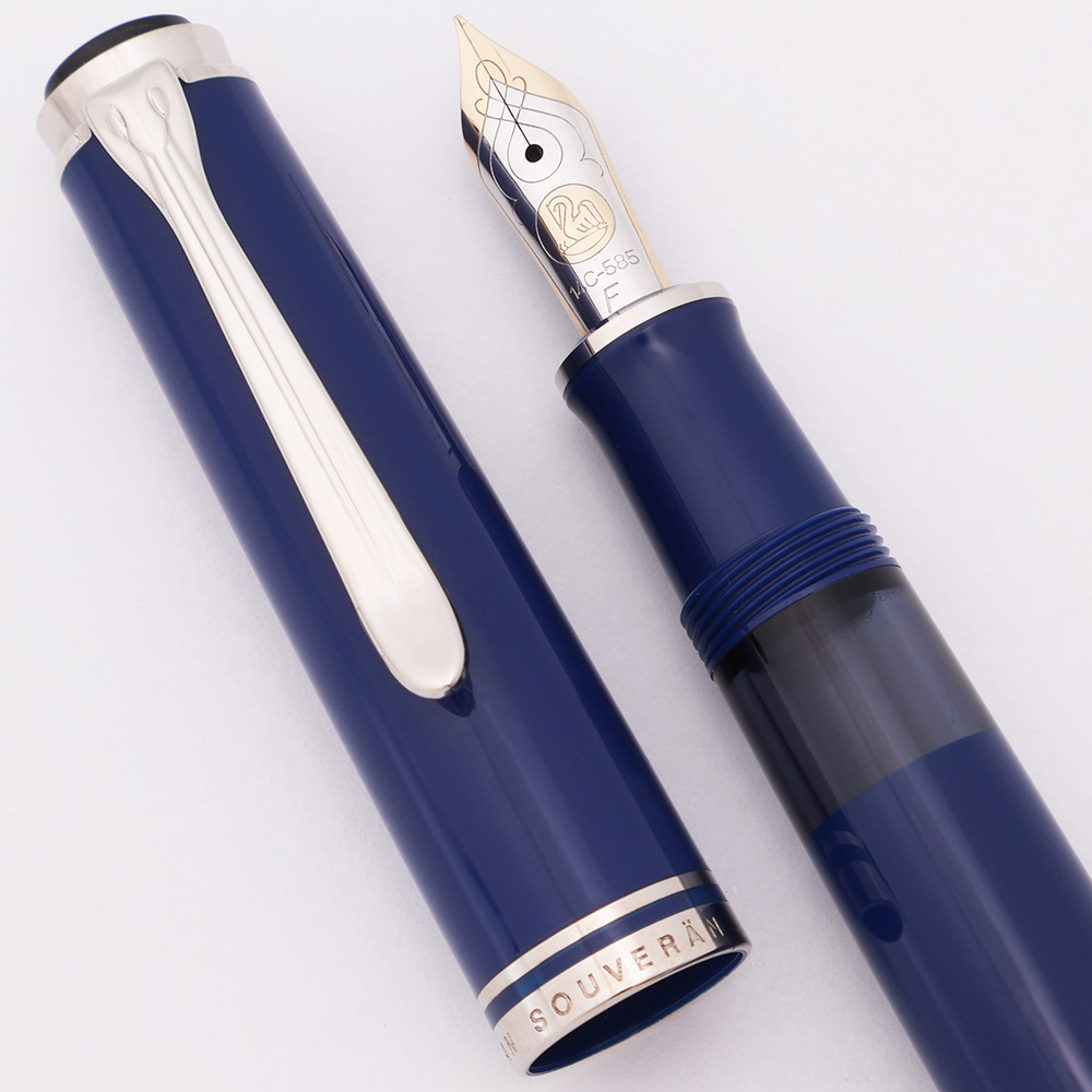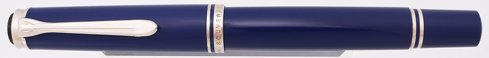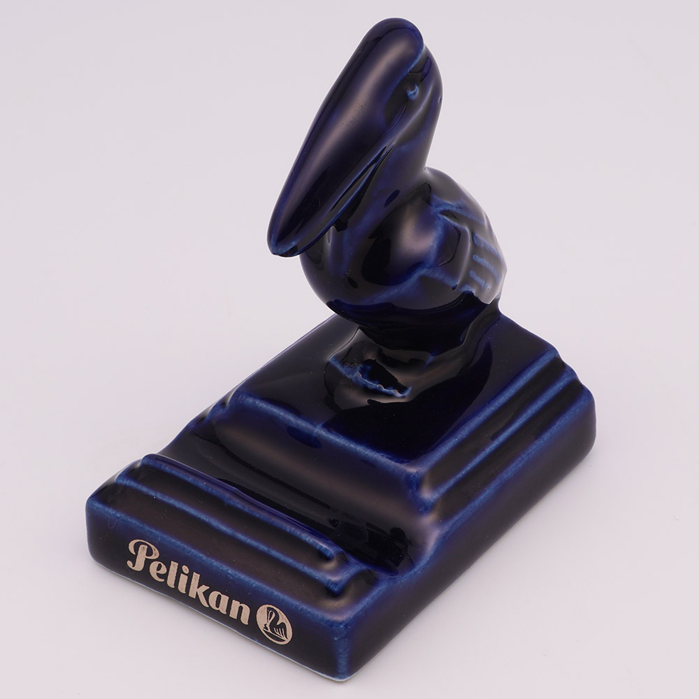 Condition Excellent + condition with no cracks, chips, dents, or dings. This is a nice-sized pen in a beautiful royal blue color. There is light scratching on both the barrel and cap. The barrel has light signs of usage mainly toward the end and on the blind cap. The cap has a few small scratches here and there. There is a tad of microscratching on the two bands on the barrel and on the cap bands. The clip is perfect. The imprints are clear. Ships in large Pelikan box with a deep blue ceramic Pelikan pelican pen rest and paperwork. There's a really great article on Pelikan's ceramic pen stands here.