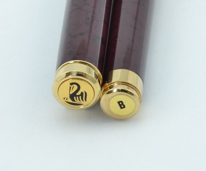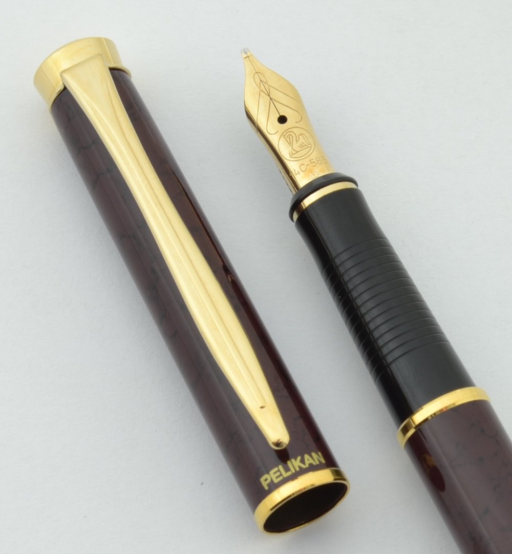 Color Marsala Red purple and black marbled lacquer finish with gold plated trim and the Pelikan emblem on the cap's crown.