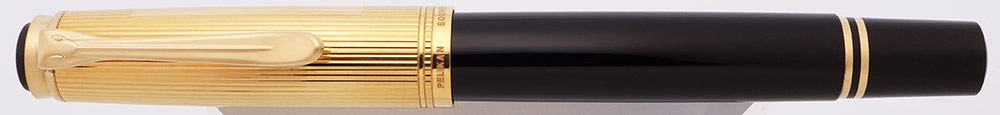Color Black barrel, and vermeil cap with lengthwise lines. Pelikan emblem on top of cap. The original clip tag is present.