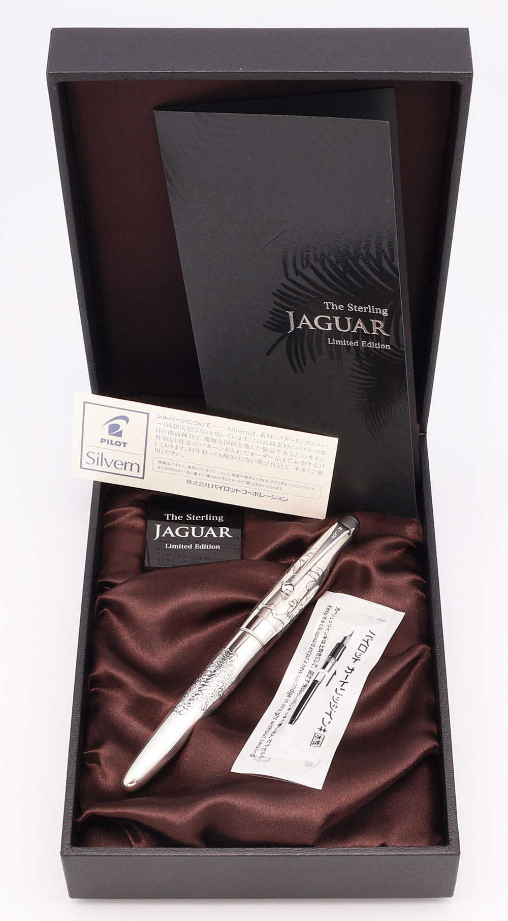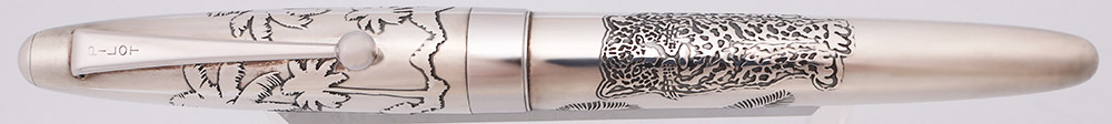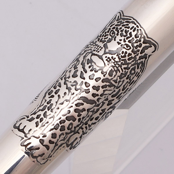 Color Sterling silver. There is an image of a jaguar and some trees on the cap and barrel.