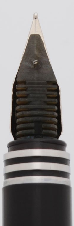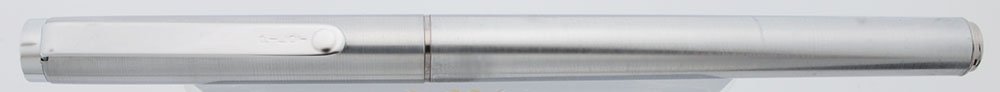 Condition Excellent + condition with no cracks, chips, dents, or dings. This is a slim, sleek pen with a monochromatic appearance. The barrel has some microscratching at the end. The cap has a couple of tiny dots of plating wear to the right of the top of the clip. The section has some long thin scratch lines. These small flaws are very difficult to see because of the brushed finish of the pen. The imprints are clear.