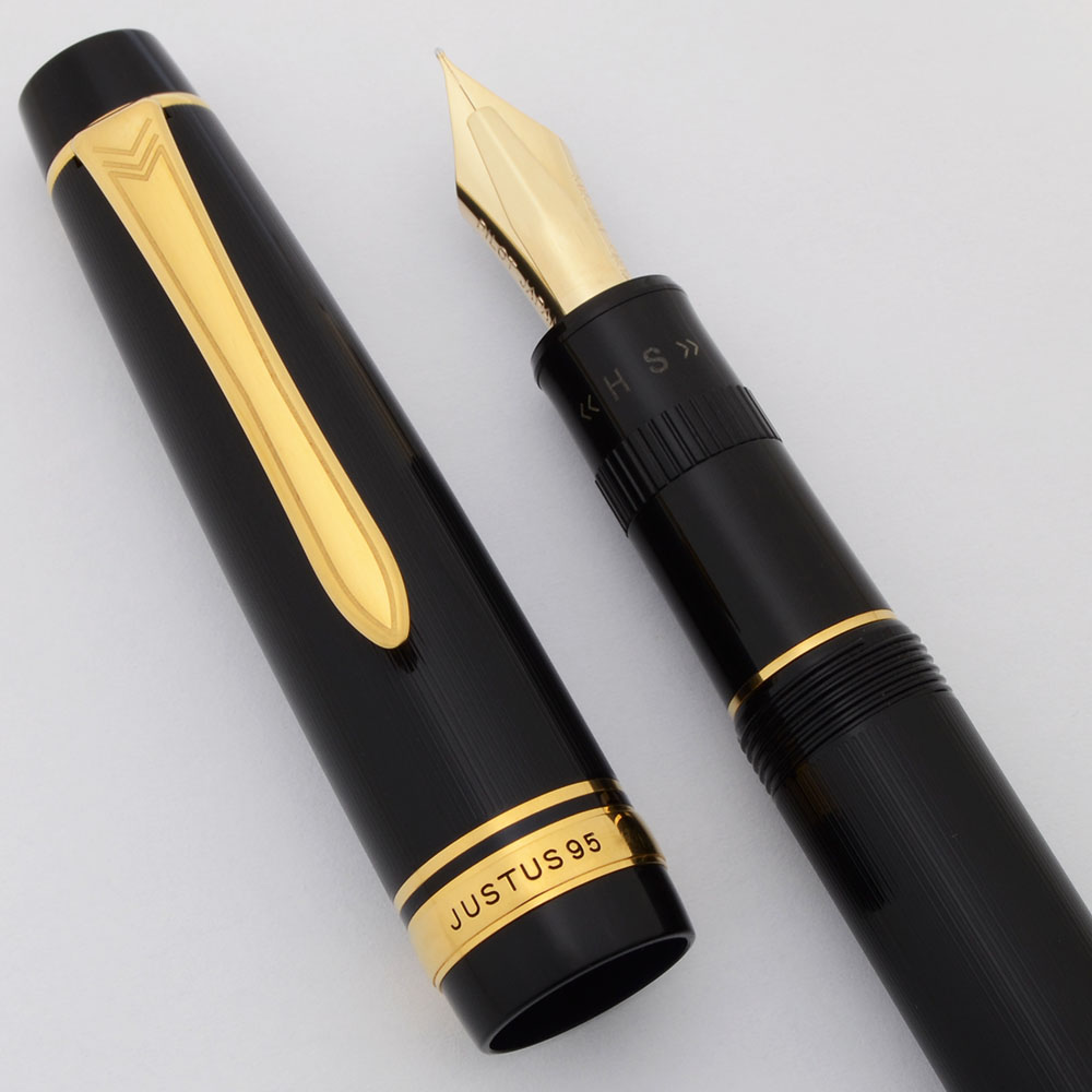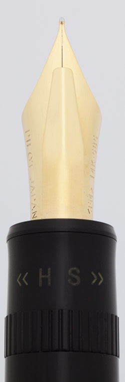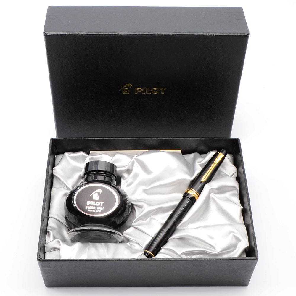 Condition Near mint condition for this elegant boxed pen that comes with a 70 ml bottle of Pilot black ink. The pen is dark, shiny, and beautiful to behold. There is some microscratching on the cap band. Otherwise, the pen is perfect. The imprints are clear.