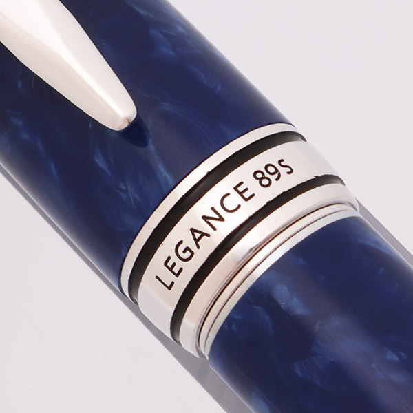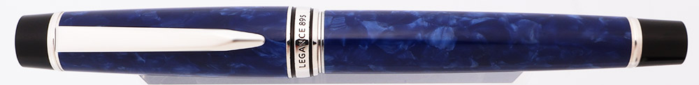 Color Blue Marble resin with rhodium plated trim. There is some pearlescence in the marbling. Black section and end pieces.