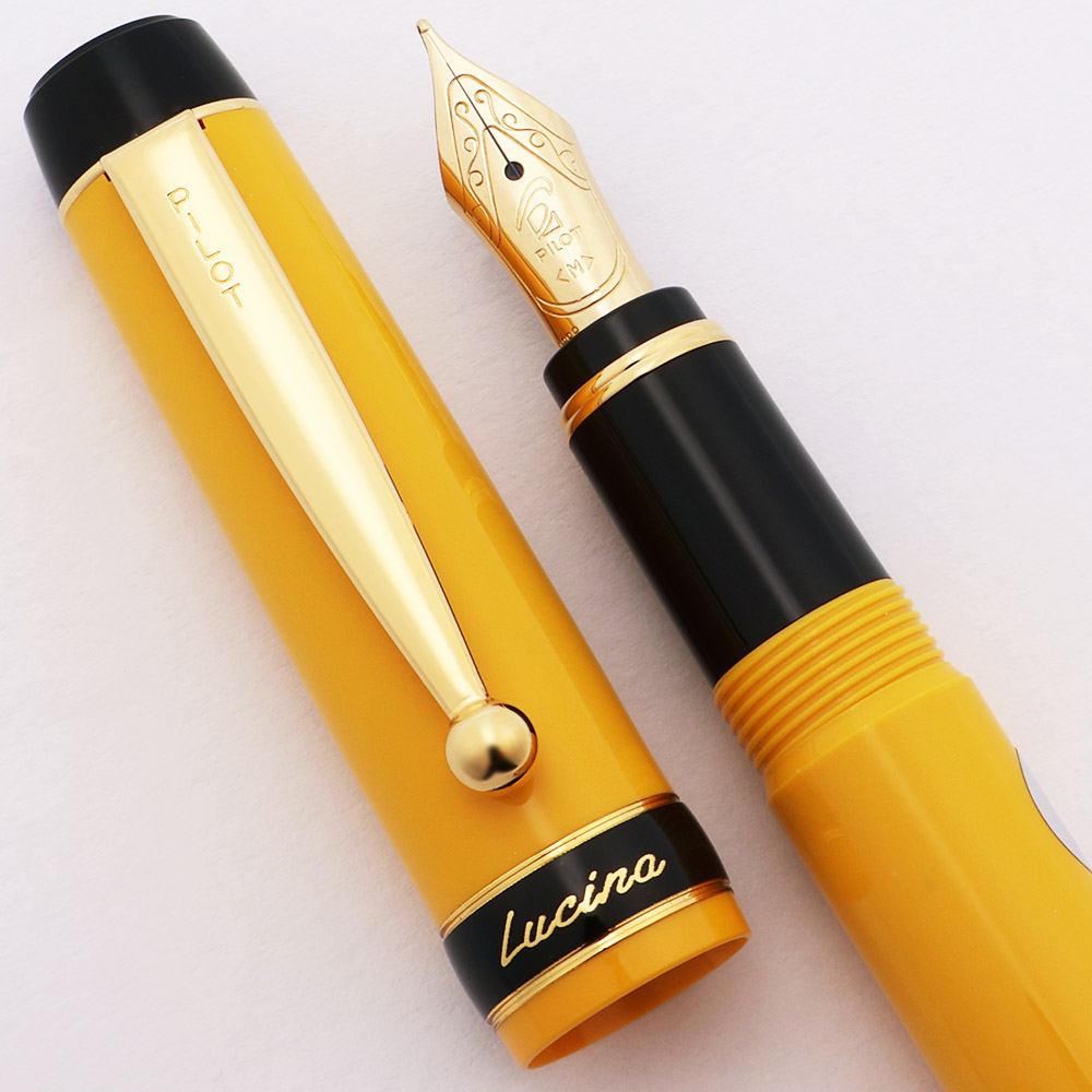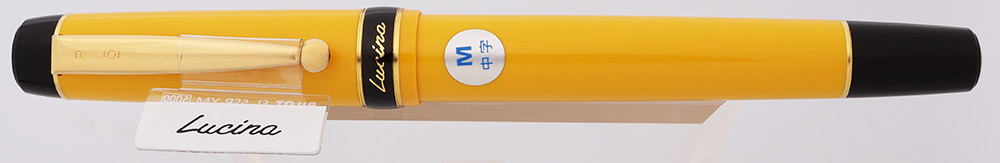 Color Yellow barrel and cap with gold colored trim and black accents on top of cap and end of barrel. Black cap band.