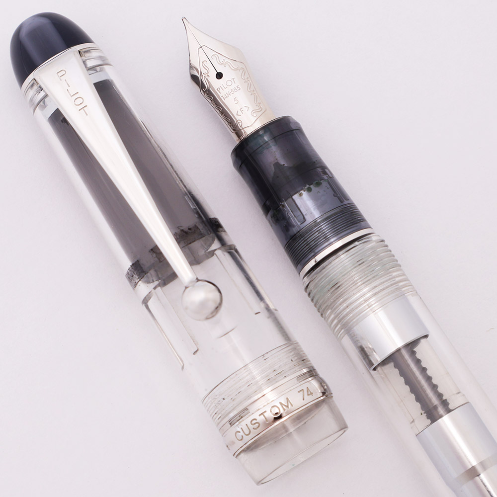 Condition Excellent condition, in box, with paperwork and a cartridge and with no cracks, chips, dents, or dings. This is a nice looking, shiny, very clear, demonstrator fountain pen. The cap and barrel have moderate microscratching. The cap band has light microscratching and the bottom edge has some plating wear. The clip looks great. The imprint is clear.