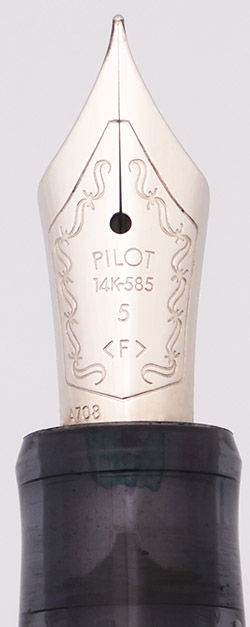 Nib FINE 14k #5 Nib. It is labeled F. The nib is rhodium masked.