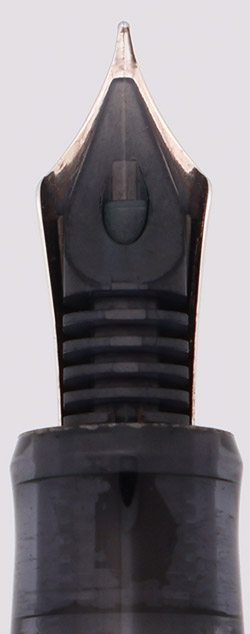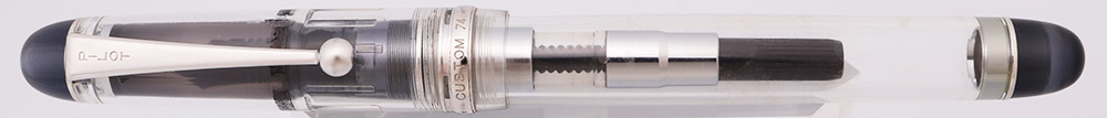 Color Clear demonstrator with semi-transparent black pieces and rhodium trim. There is a gray plastic sleeve in the cap to balance out the appearance of the CON-70 converter. It looks quite symmetric.