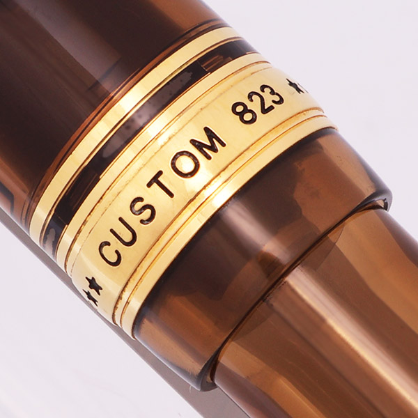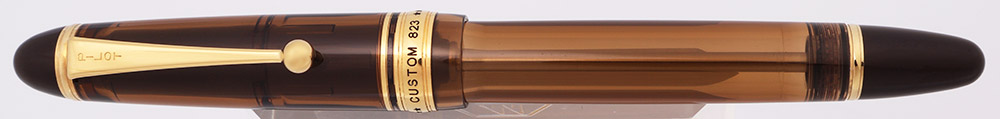 Condition Near mint, in deluxe gift box, with glass bottle of ink and paperwork. no cracks, chips, dents, or dings. This is an amber demonstrator that looks excellent and that has nice styling. The barrel is excellent with no scratches to be seen. The cap has light microscratching. The cap band has moderate microscratching and smudges and dots of plating wear. The clip looks nice. The clip ring has dots of plating wear. The imprints are clear.