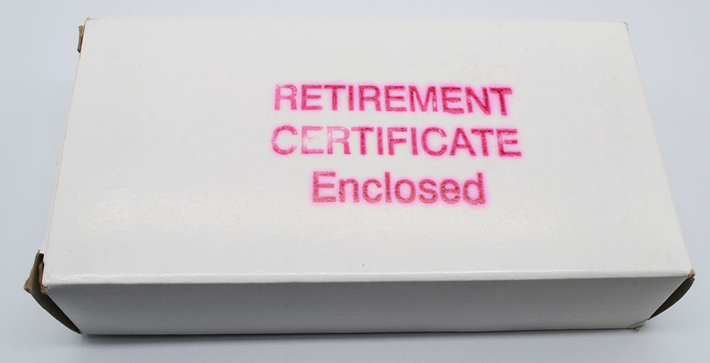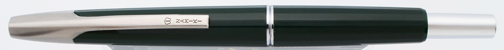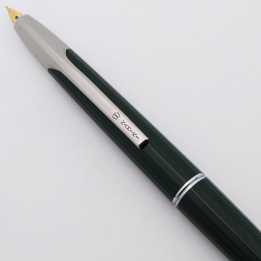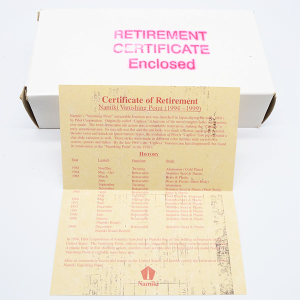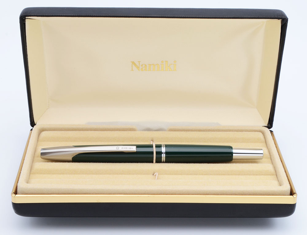 Condition Excellent + condition, in a black leather box, with paperwork. This is a unique, stylish pen, in a dark green color. The cap and barrel have a few light scratches and a few little marks. No cracks. The trim looks great. The imprints are clear. Included in the paperwork is a "certificate of retirement", announcing the retirement of the Namiki Vanishing Point in the United States. The outer cardboard box is also stamped "Retirement Certificate Enclosed".