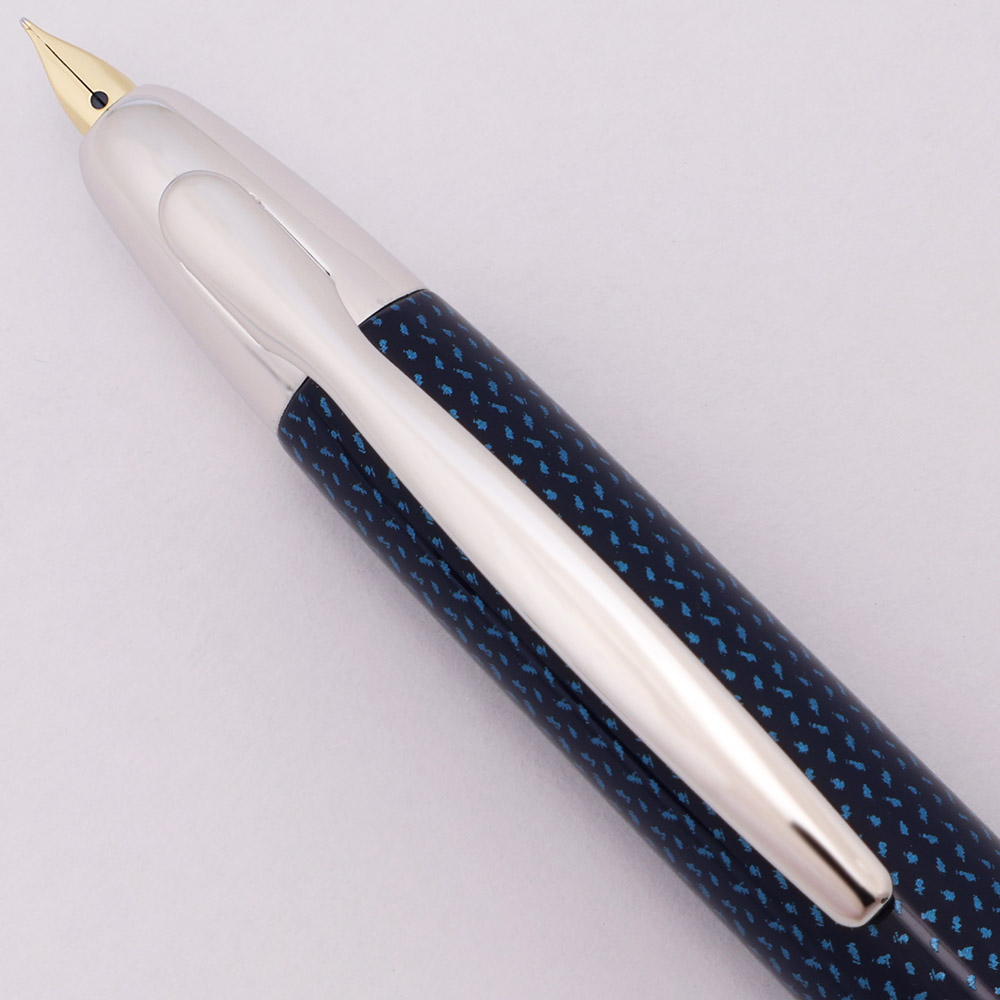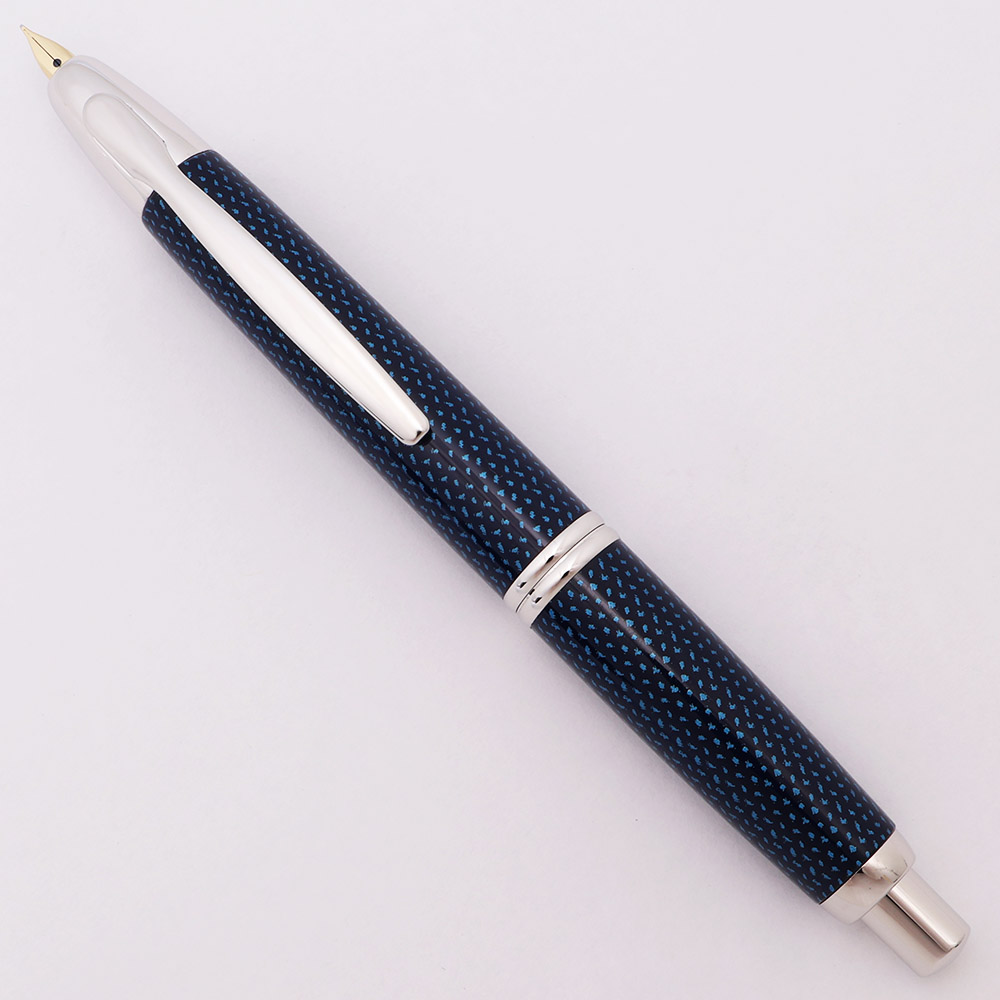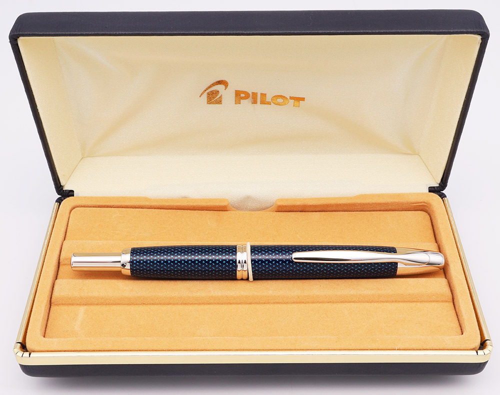 Condition Excellent + condition with no cracks, chips, dents, or dings. This is a shiny dark blue pen with an intricate pattern on the cap and barrel and a unique overall design. We can't really find any marks or scratches on the cap and barrel. The rhodium trim, including clip and clicker, has a few tiny marks under magnification, but looks all smooth and shiny and basically new in hand. The imprints are clear. Ships in Pilot box with paperwork, a metal cartridge sleeve, and a cartridge. The clip tag is also present.