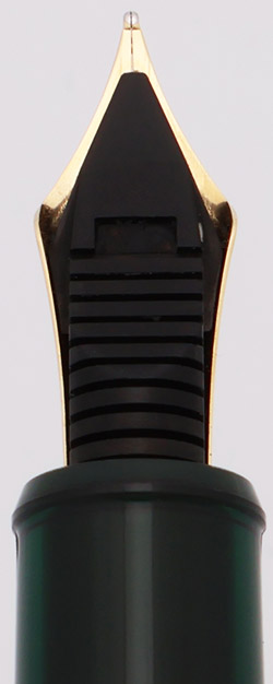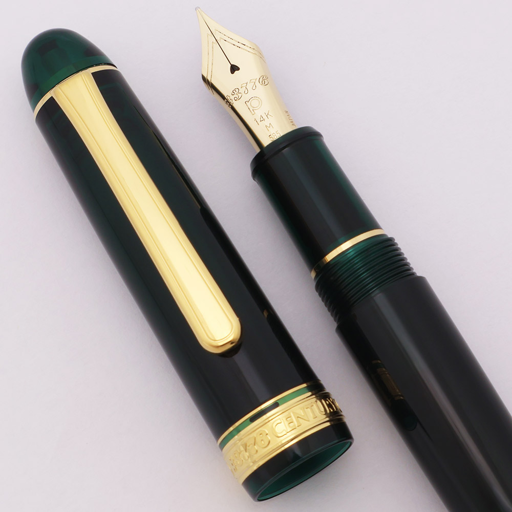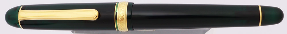 Condition Near mint condition with no cracks, chips, dents, or dings. This is a dark green semi-transparent pen that is shiny and beautifu. The cap and barrel have very light microscratching, primarily near the end of the barrel. The cap band, clip and clip band are excellent. The imprints are clear.