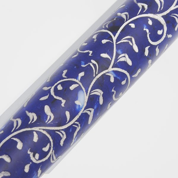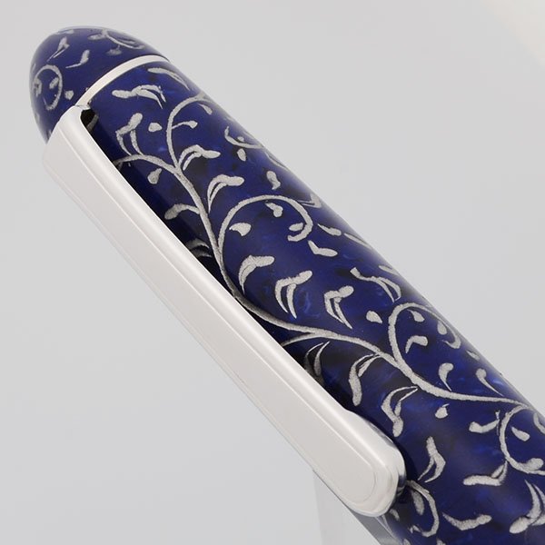 Color Blue celluloid with engraved design which is filled in with silver. Rhodium-plated trim.