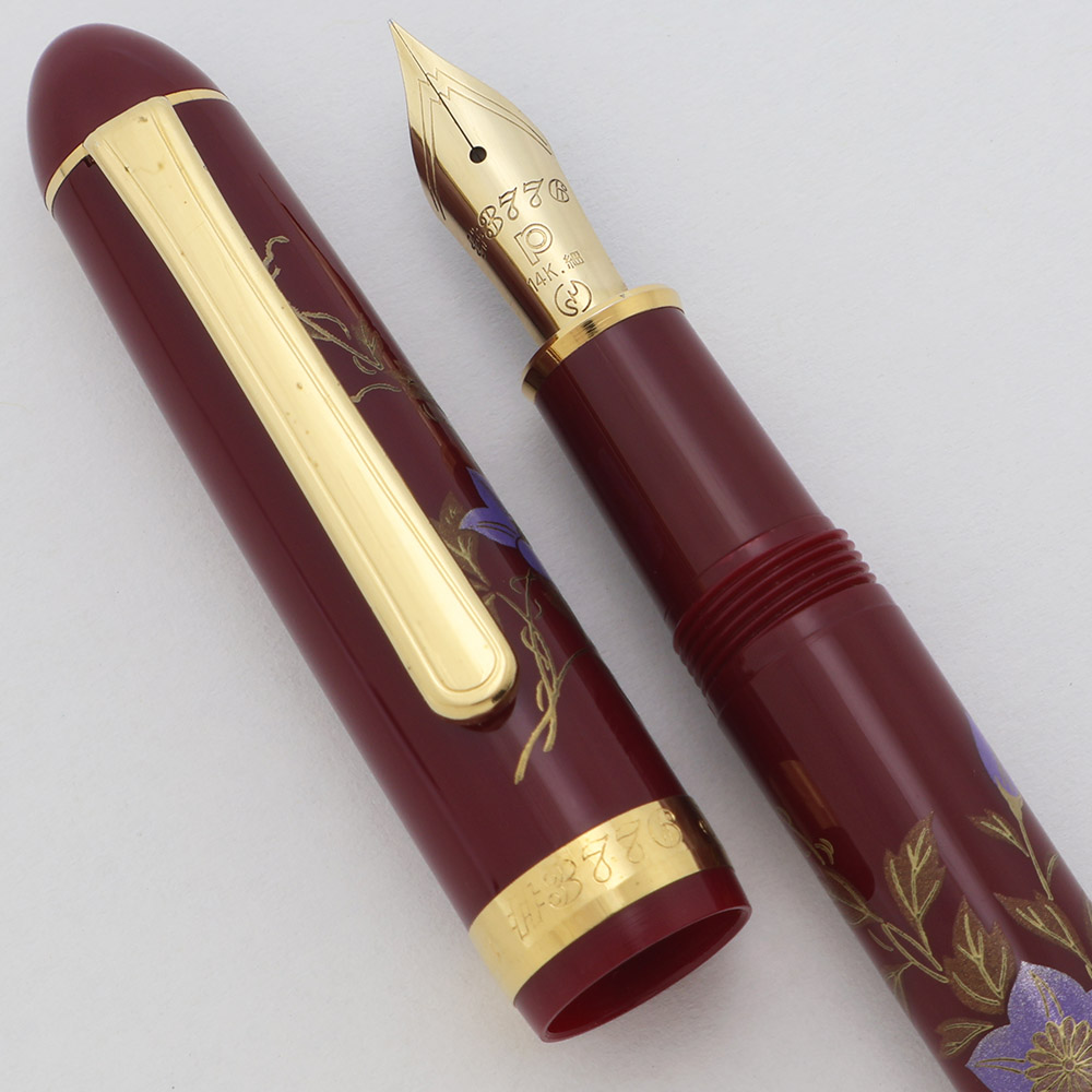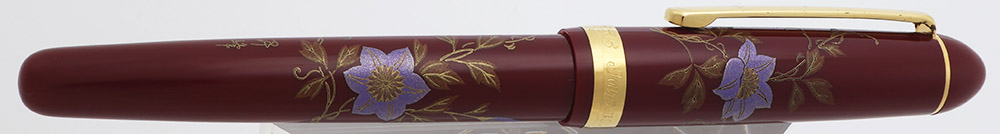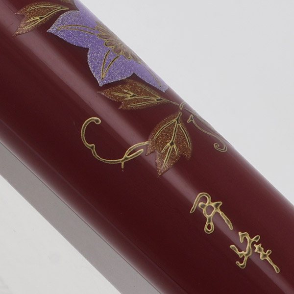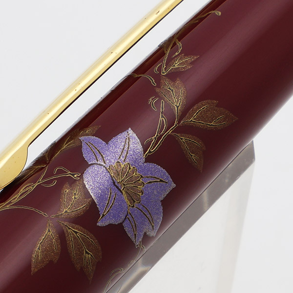 Color Burgundy pen with gold trim. Platinum design is a painted pattern of purple morning glories with gold leaves. The painting or "maki-e" is over plastic. The trim is gold plated.