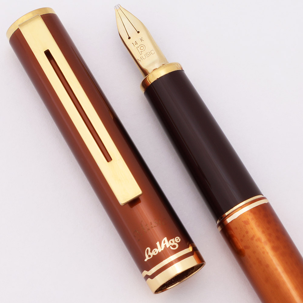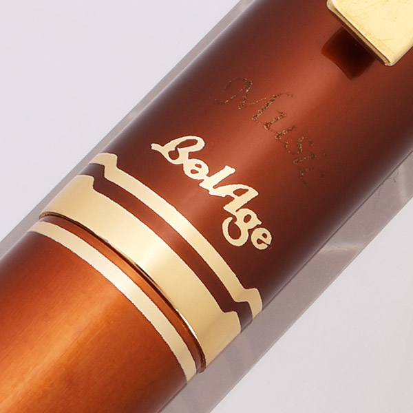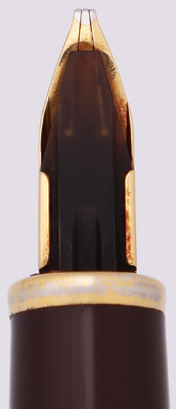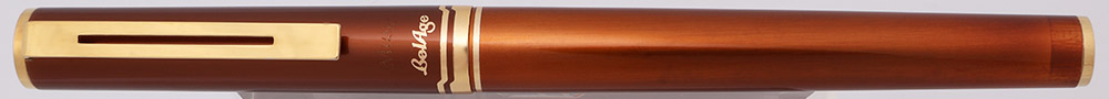 Condition Excellent + condition with no cracks, chips, dents, or dings. This is a satin-y, shiny pen in a deep bronze color. The cap and barrel look great with no scratches. The coloration at the end of the barrel is a bit spotty and has a stained appearance that presents as a darkening from a distance. The cap band looks great. The clip and clip ring have light to moderate microscratching and a few small dots of plating wear. The imprint is perfect.