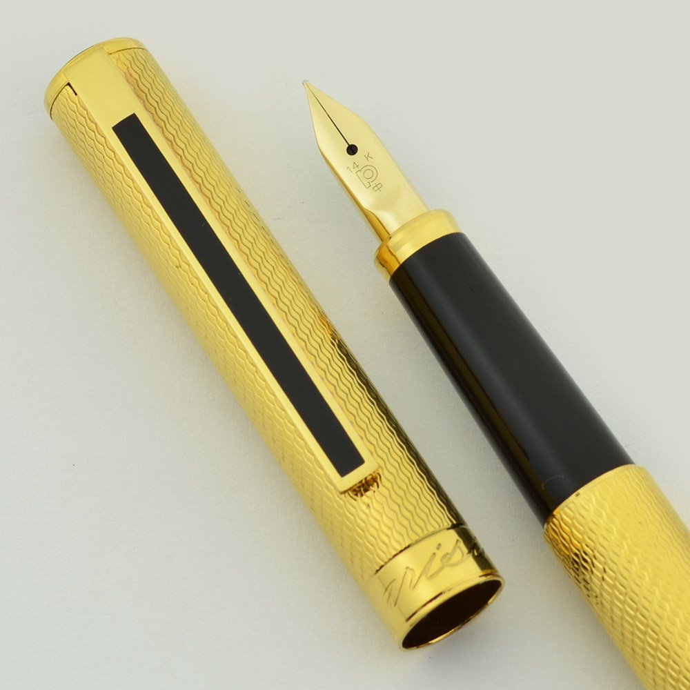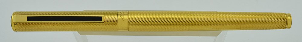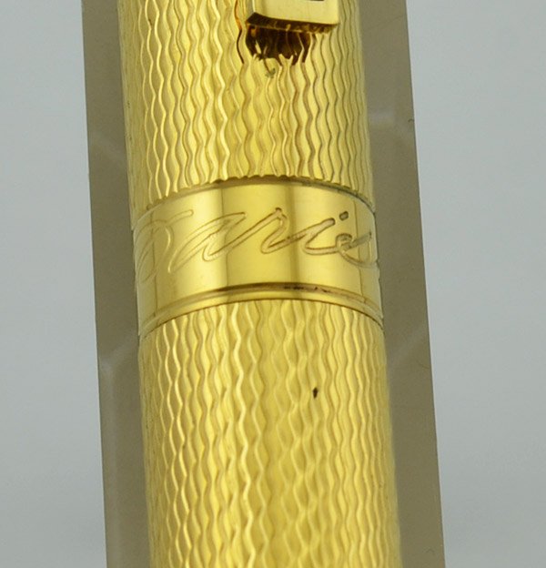 Color Gold plated pen in a guilloche or barley pattern. It has a black cap jewel and a cartouche on the barrel. The trim is also gold plated. The section is black and smooth. The clip has a black overlay