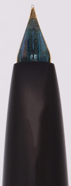 Condition User grade condition with no cracks, chips, dents, or dings. This is a velvety black, shiny pen in a classic pocket design. The section looks great. The short barrel portion has marks caused by posting. The long cap has moderate scratching, with a few long jagged scratches. The top of the cap has a cluster of small scratches on one edge of the slanted top. The cap band has moderate microscratching and two scratches that come from the long scratches on the barrel. The decorated clip has plating wear along the edges and some heavy scratching, especially on the bottom half. The slanted gold top of the cap has moderate microscratching all along the edge. The imprint is clear.