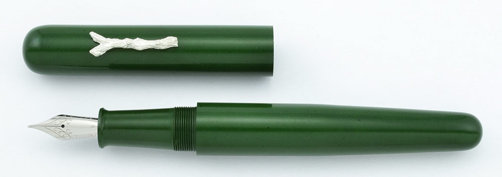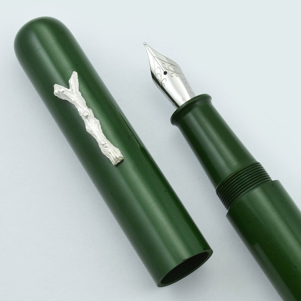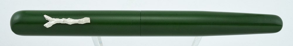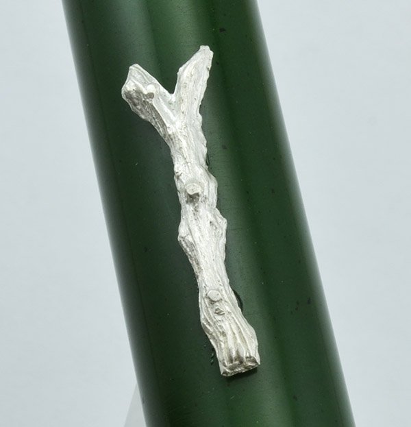 Color This pen is smooth solid forest green ebonite. The roll-stop is in a forked branch shape and hand-made from sterling silver.