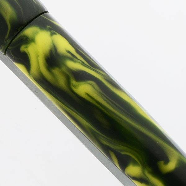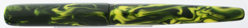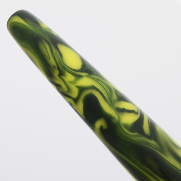 Color "Green Snake" alumilite (green and yellow, no shimmer or iridescence). Polished glossy finish. It has a glass enamelled PSP sterling emblem in the cap. Flat ends, rounded.