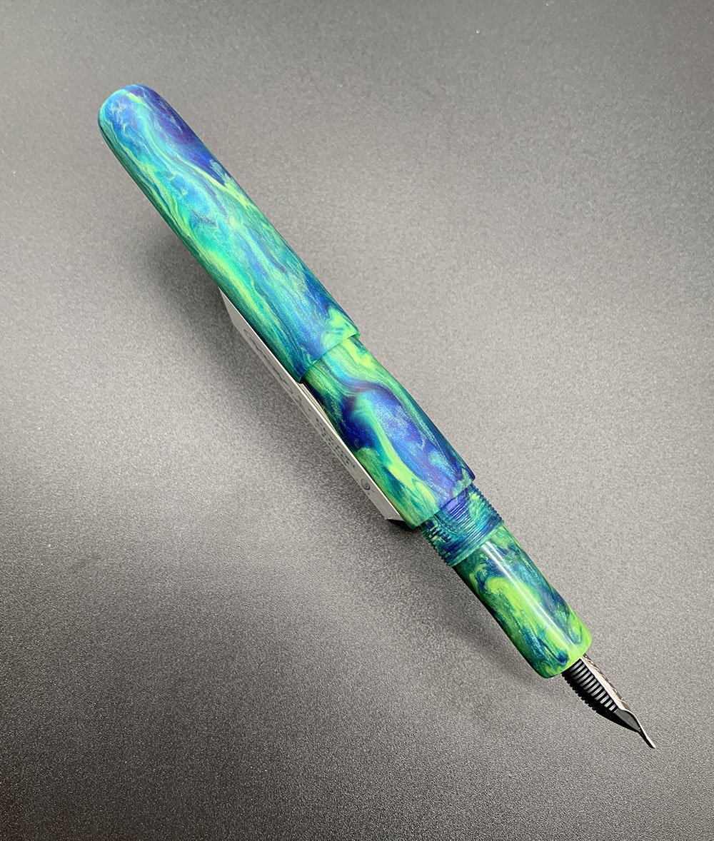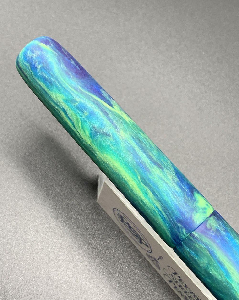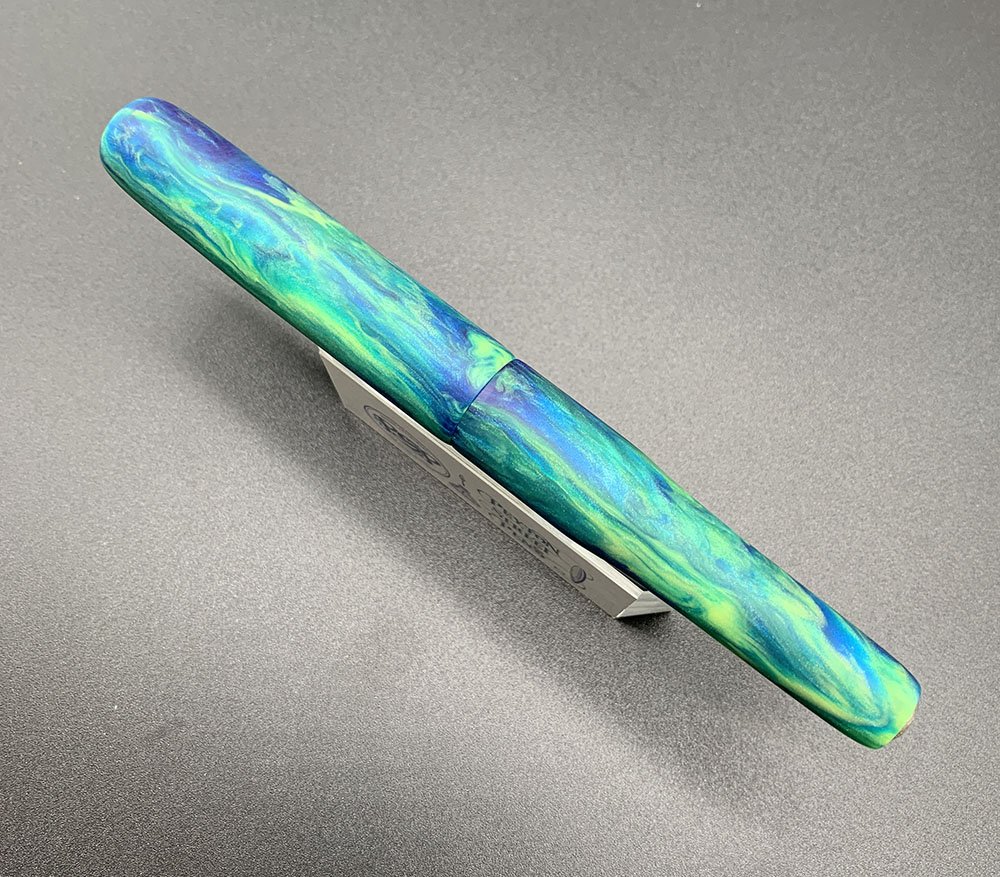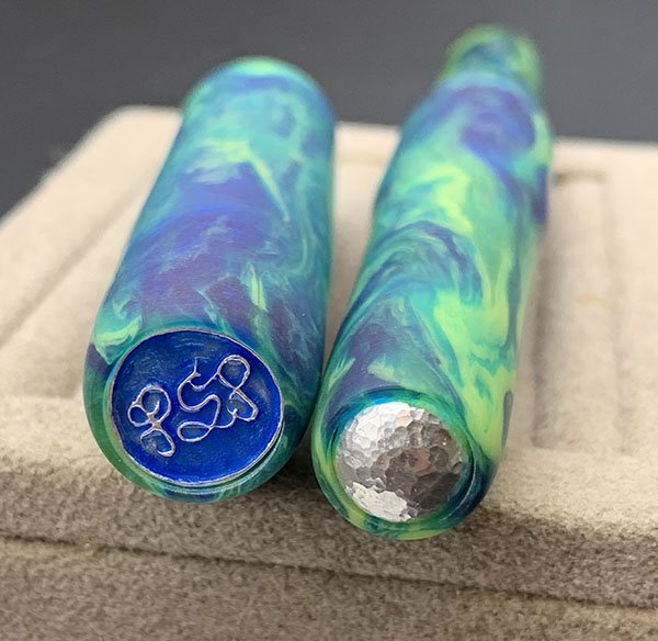 Color "Parakeet" alumilite (blue, green and yellow with some irridescence). Matte finish. It has a glass enamelled PSP sterling emblem in the cap and a hammered sterling dome in the end of the barrel. Flat ends, rounded.
