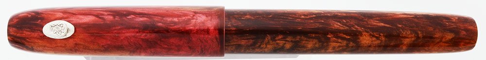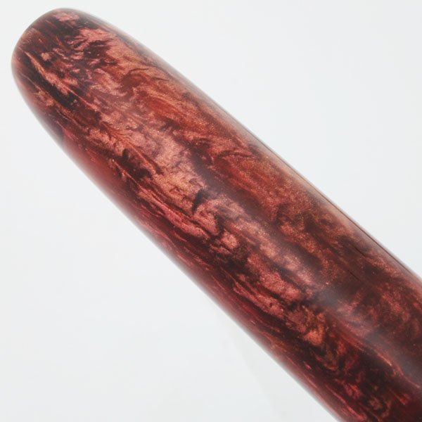 Color Reddish brown and brownish red alumilite, mottled and sparkly. Rounded with flat ends. The photographs do not pick up the sparkling and luminiscent aspects of the coloration. With a sterling roll stop on the cap in a tiered oval shape.
