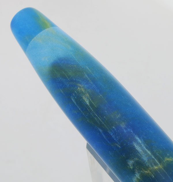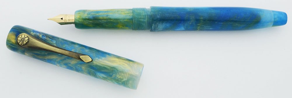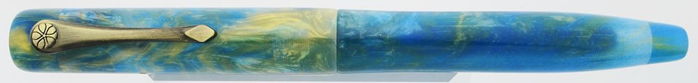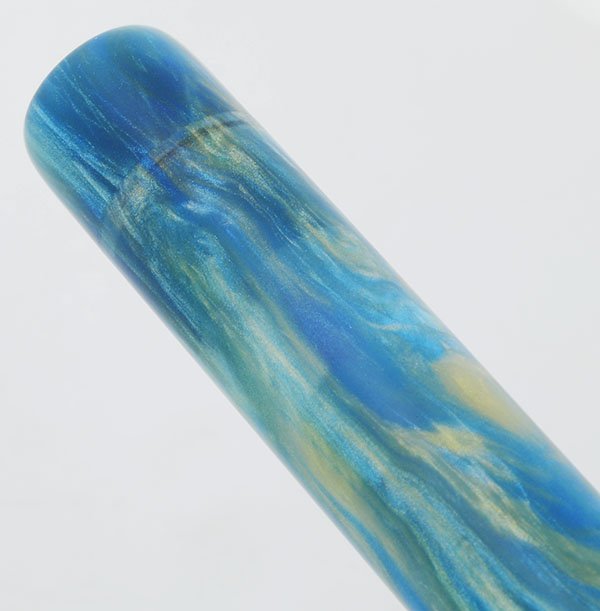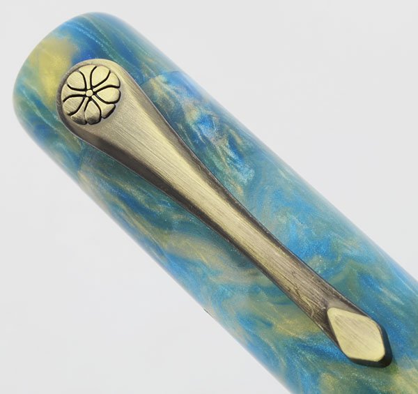 Color "Bright Water" alumilite, a unique combination of bright blue with greenish gold streaks cast by Peyton Street Pens. Bronze colored clip.