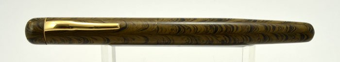 We have configured this pen as a blow-filler. It's a simple filling process: put the nib in ink, and blow in the hole in the end of the barrel. (Surprsing little pressure is actually required.) Leave the nib in the ink for a few seconds, pull it out and wipe off any excess ink on the section. The pen is ready to write. You don't need to unscrew the barrel, but if you did you'd see a simple rubber sac which will be easy to maintain and replace if it ever wears out. |
