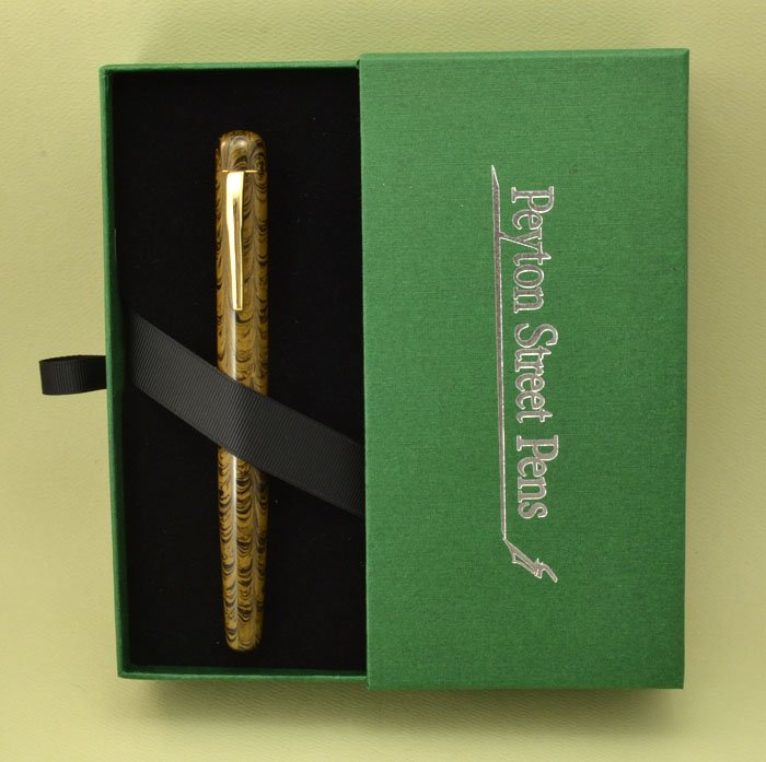 This pen has the bakul (matte) olive ripple pattern. The clip is gold colored, and can be removed for a sleeker look. Some of the photos below show a pink ripple model, and some show brown ripple, but this listing is for a dark blue green ripple pen. |