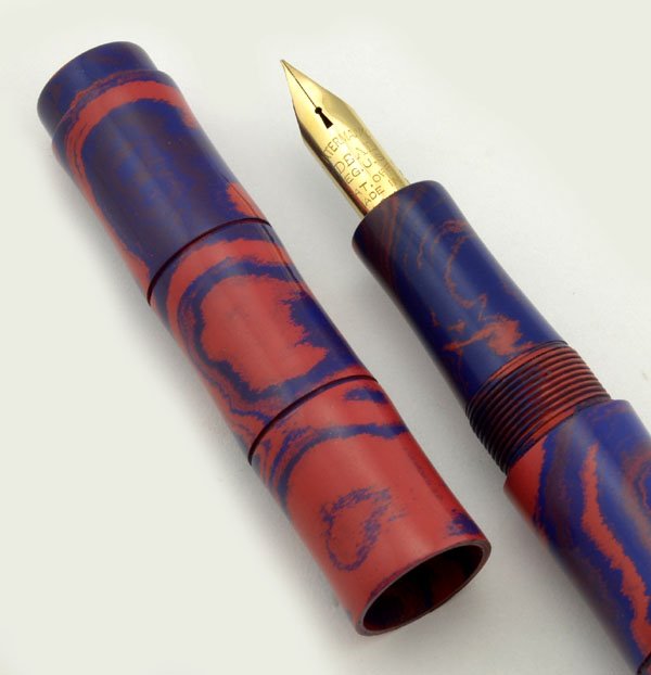 Color | This pen has the shiny and smooth finish, in a swirled pattern of blue and dark pink. This is one of the "premium ebonite" colors. |