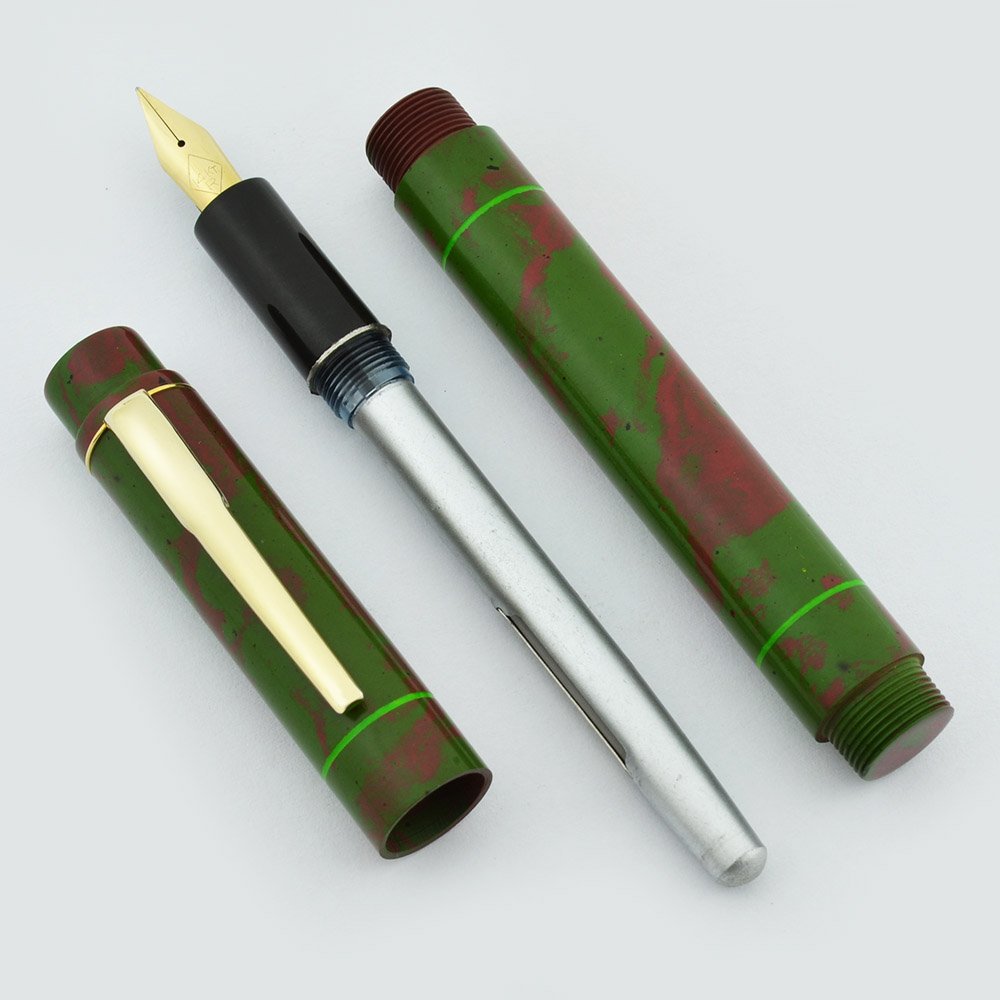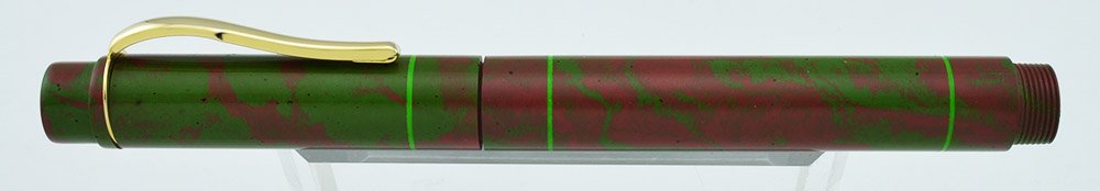 Color Smooth green and red mottled ebonite with lime green accent lines and a gold colored clip.