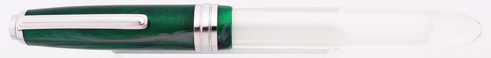 Color Green cap and section with some grey striation, clear barrel with a frosted lining, crystal clear end of barrel. Silver colored trim.