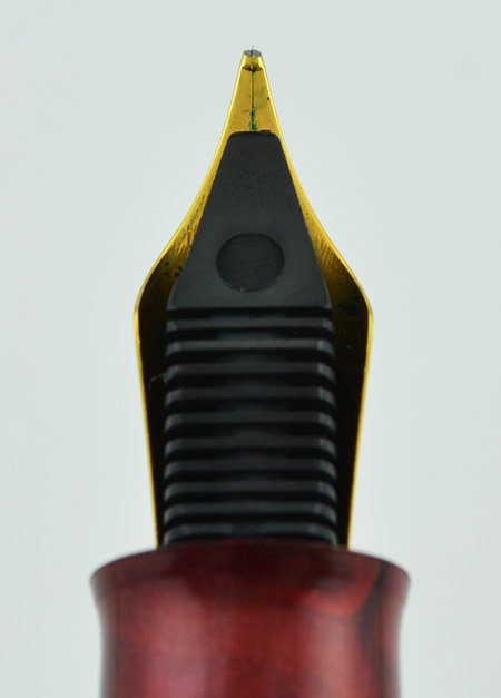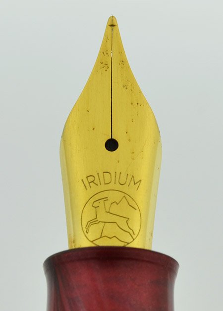 Nib Gold plated steel nib. It is an unmarked Bock nib. It has some plating wear and light pitting and looks like a medium.