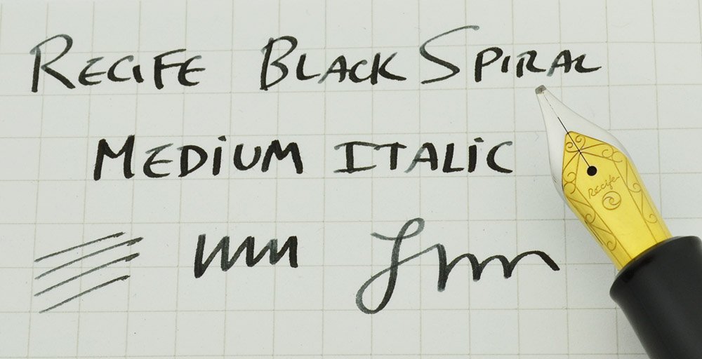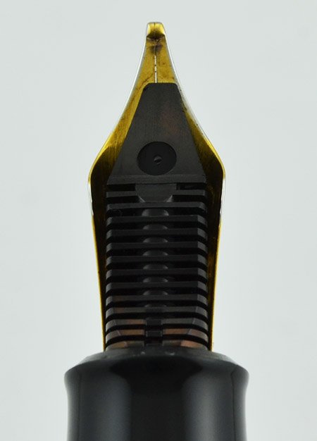 Nib Medium Italic two tone steel nib. It's smooth and has lots of tipping material. It was cut on the top and slopes downward now. See the writing sample below.