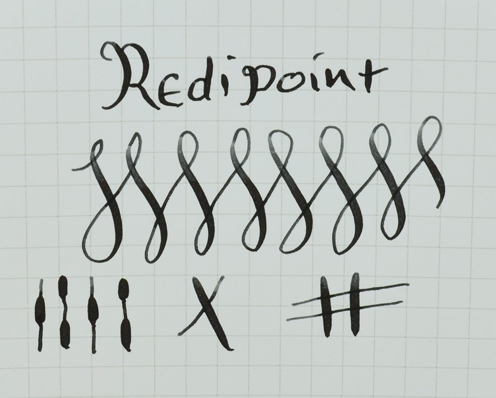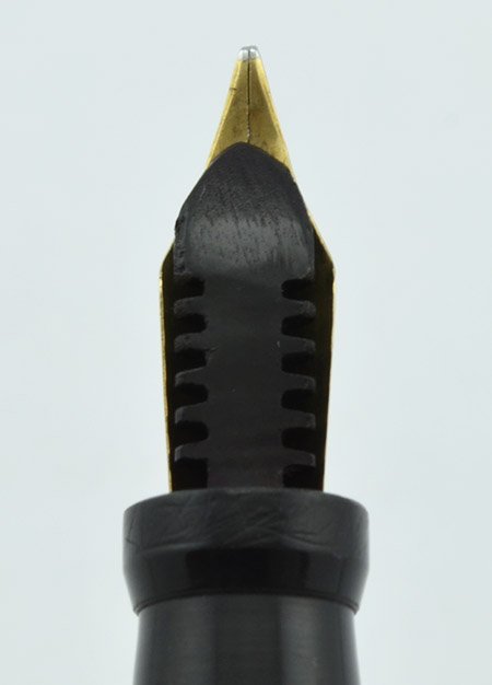 Nib FLEXIBLE MEDIUM Warranted #3 14k gold nib is smooth with slightly worn but sufficient tipping material. It's what we would describe as fully flexible, with easy line variation from medium to double broad under just light pressure, and nice springback. See our writing sample below.