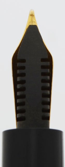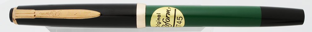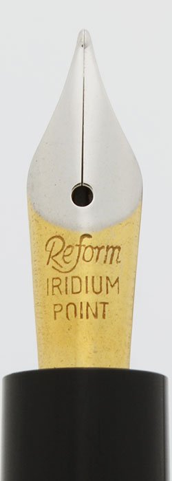 Nib Fine formerly gold plated nib. The plating has worn away from the front half of the nib. The nib is unlabeled but it has longer and narrower tipping material than our other Reform 1745 so we're calling it a fine. It is smooth and springy.