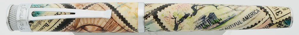 Color Stamps inspired by the earlier Cherry Blossom pens were printed and lacquered onto the pen. Each pen has the Fahrney's stamp and then one additional one. This makes each pen unique. All the fountain pens have the Jefferson Memorial stamp. It has silver colored trim.