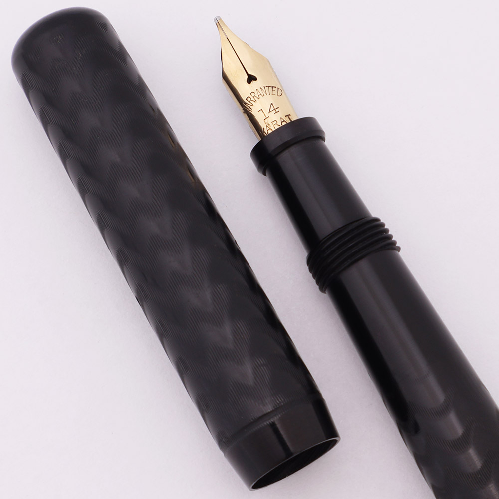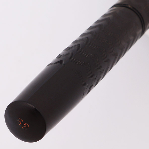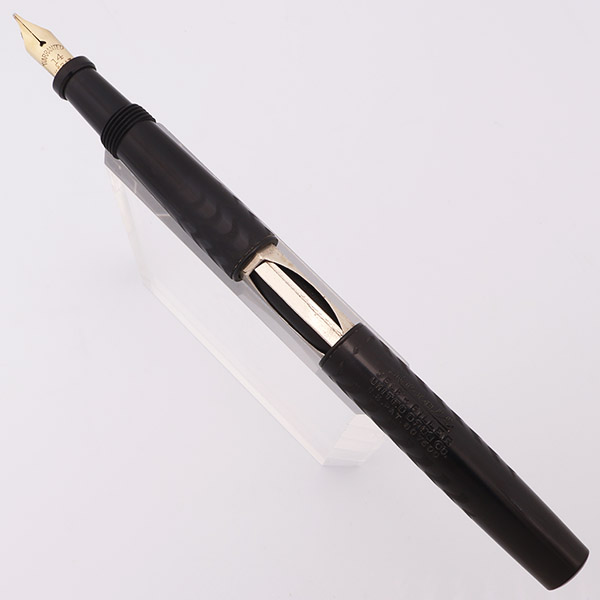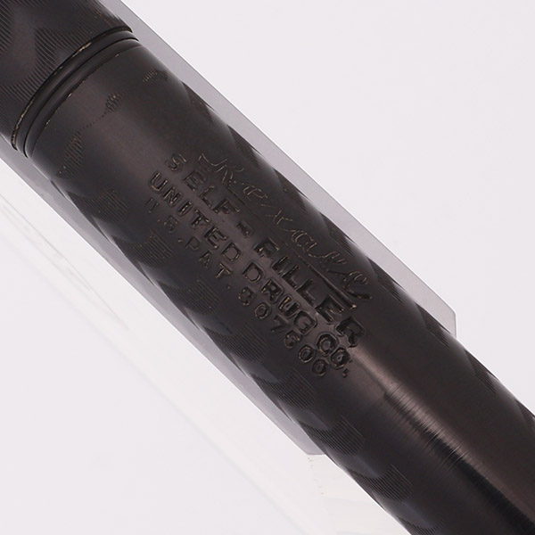 Condition Excellent + condition. The color is nice and dark, and mostly even throughout the pen - just a tiny bit of difference where the cap covers the section and barrel. The chasing pattern is strong and clear. No cracks or chips. The imprint is clear and easily read.