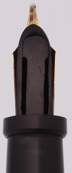 Filling System Sleeve-filler - it's basically a mechanical ink sac squeezing system, but the end of the barrel is a sleeve that pulls out to reveal the sac and pressure bar. Insert the nib and part of the section into the ink, press and release the pressure bar a couple of times, waiting about 3-5 seconds between each squeeze. Remove the pen from the ink, wipe off excess ink, and move the sleeve back into place to keep you from accidentally squirting ink out. We installed a new sac and tested the system and it's working very well.