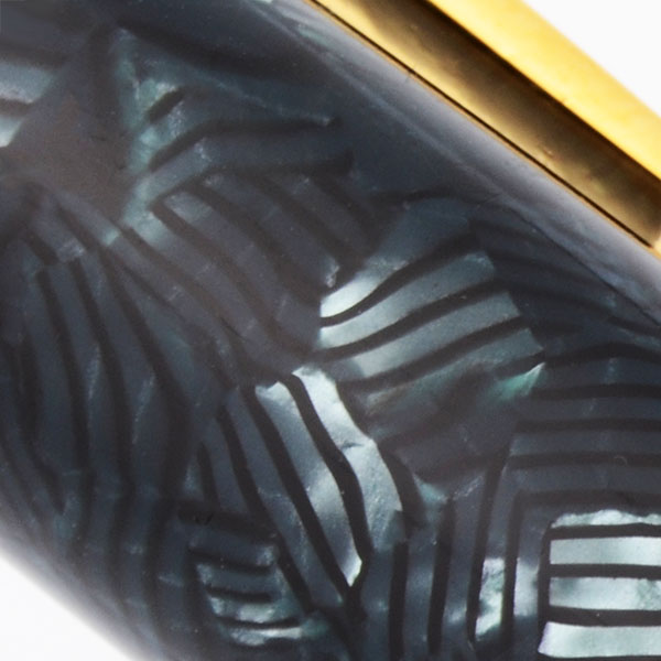 Color Dark Blue, opalescent light blue and black "candy stripe" patterned celluloid, with matching section. The material was madde by Visconti. Black finials, and the company's distinctive red ring around the end of the barrel. Gold plated trim.
