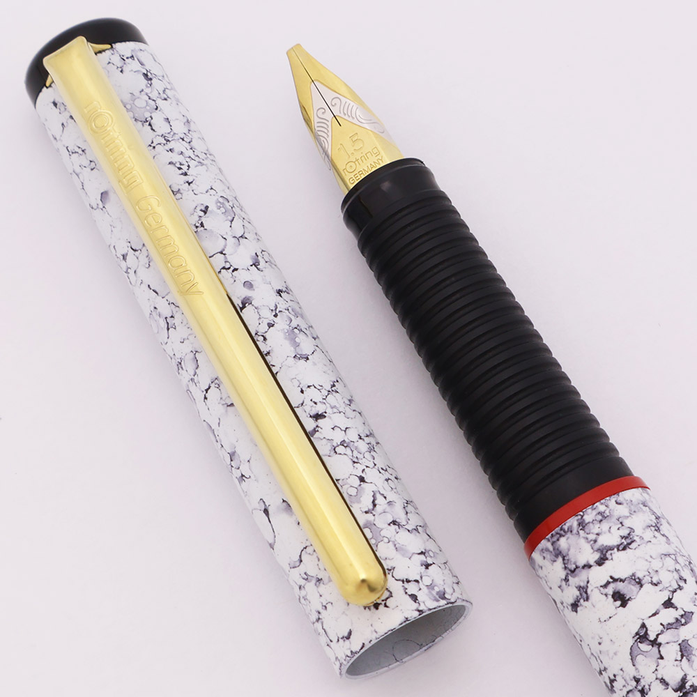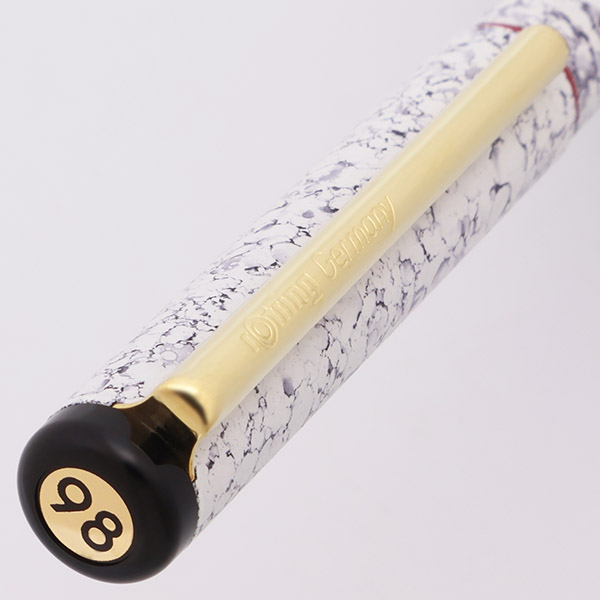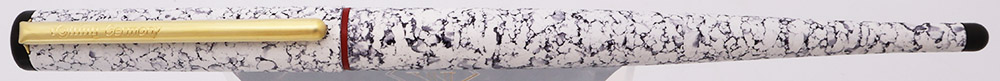 Color Black and white spackled pattern with black end pieces. Red ring separates the section from the barrel. Black ridged section. Gold plated clip.