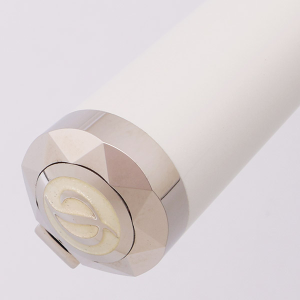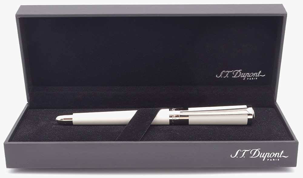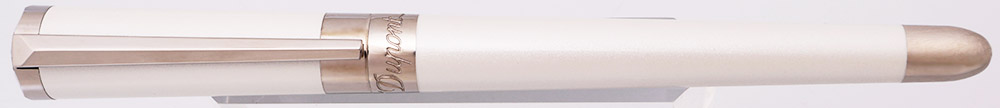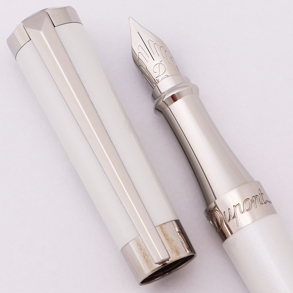 Condition Near Mint in box. The pearly portions of the cap and barrel look perfect. The section and some of the trim has tiny microscratches and faint polishing marks, though the majority of the pen looks almost untouched. There are some hints of tarnish on the cap band near the clip (see first photo below), which is really hard to see under magnification. The pen presents nicely in the hand, very elegant and shiny. The imprints are clear. The clip bears the serial number 5EBBS83. Ships in ST Dupont box with paperwork under the platform, and outer cardboard box.