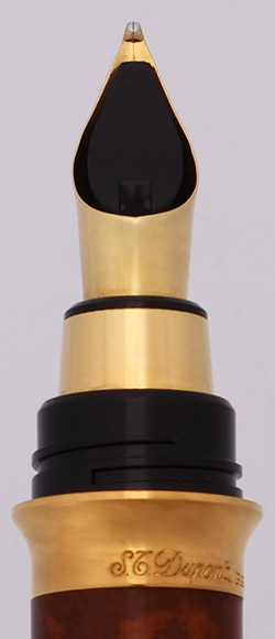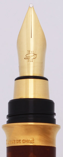 Nib 18k Broad nib. When the section is unscrewed, just above the threads it is labeled B for broad. This is a nice wide nib. It's smooth and looks good.