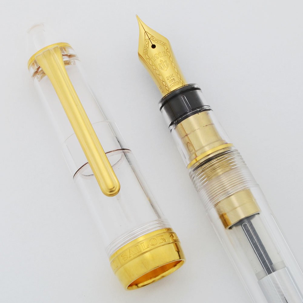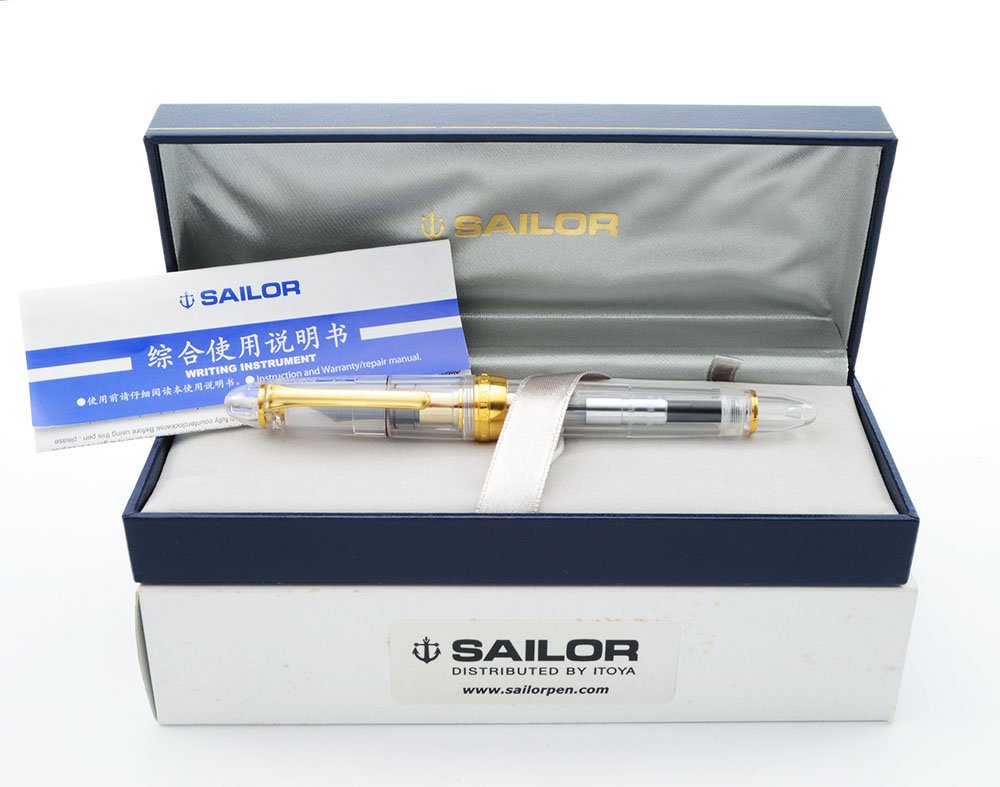 Condition Near mint condition for this beautiful substantial pen that is housed in its original Sailor box with an installed converter, one ink cartridge, and instructions. There is a little plating wear on the upper edge of the gold part that can be seen thru the section. The pen has slight wear and microscratching. The cap band, clip, and trim are beautiful. No cracks, chips, dings, or dents. The imprints are clear.