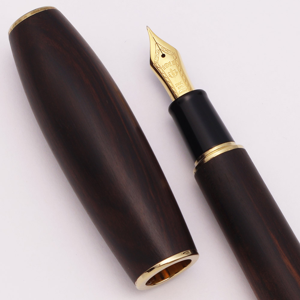 Condition Excellent + condition in box. We think there is some light scratching on the cap and barrel, though it's difficult to distinguish between scratches and natural grain and variations in the wood. There may also be some marks towards the end of the barrel. The section has light scratching. The gold trim looks great. Ships in wooden box with paperwork.