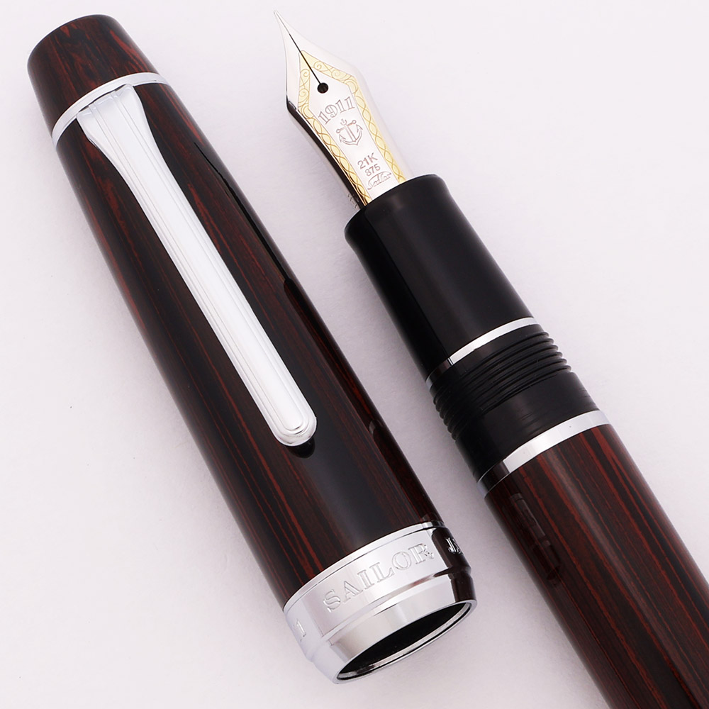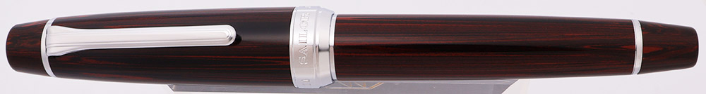 Color Red & Black - Sailor called this "Classic Marble Hard Rubber Silver", and it's a sort of woodgrain appearing red and black ebonite, with rhodium-plated trim. The section is black plastic.