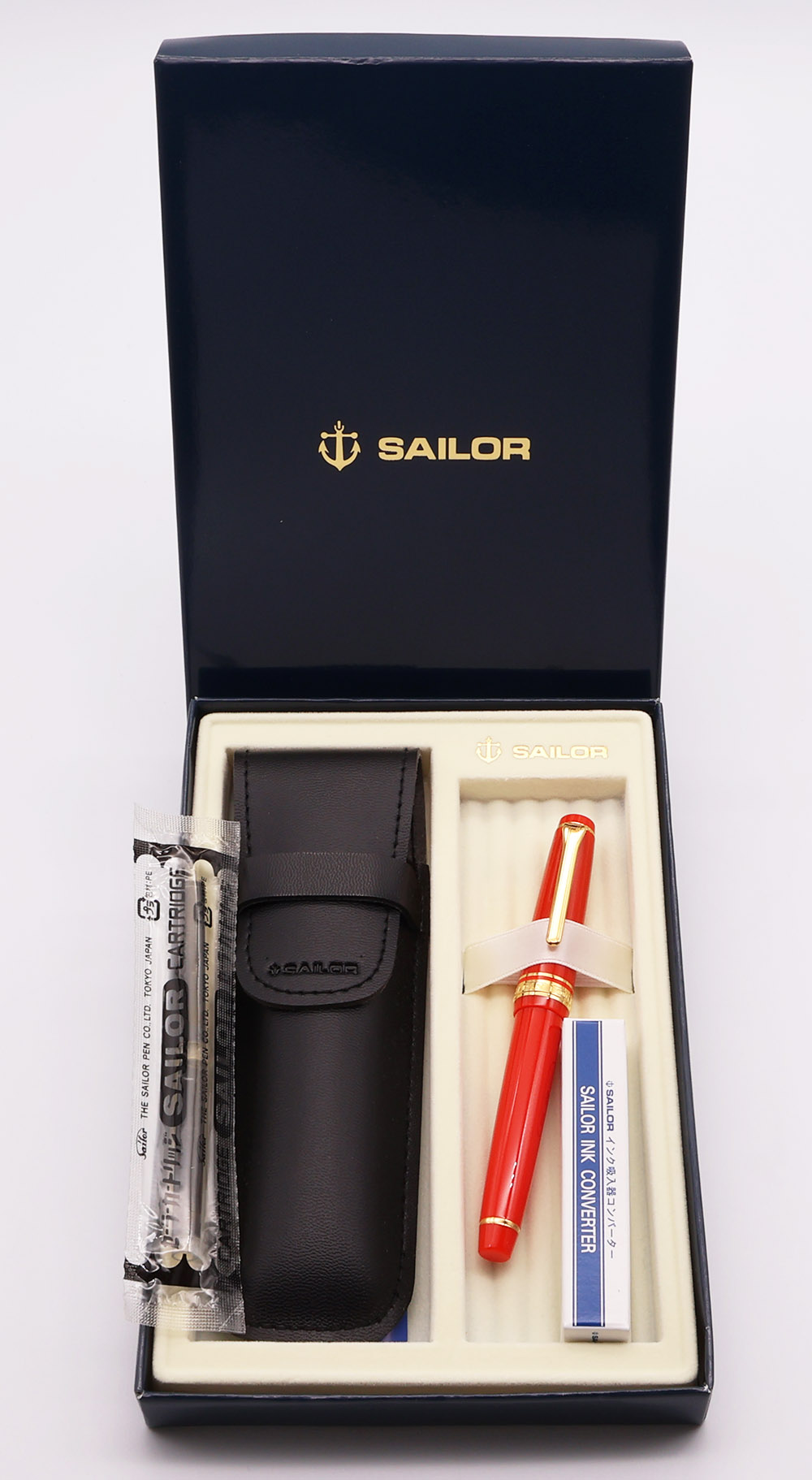 Filling System Sailor cartridges or a converter. Both are included in the box.