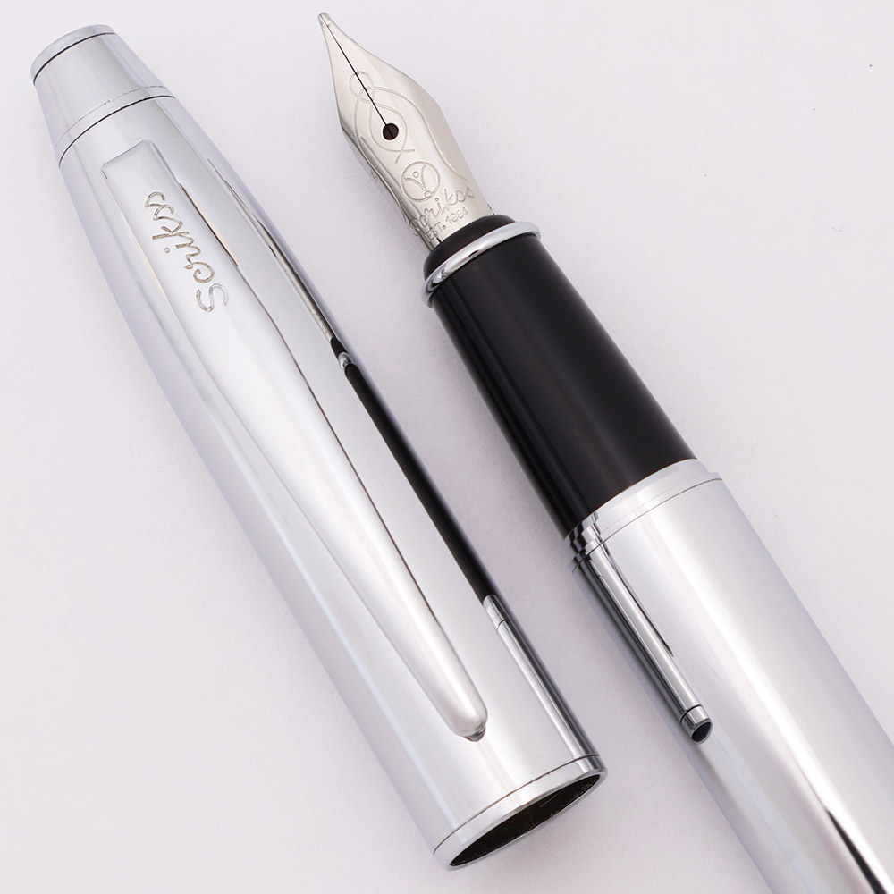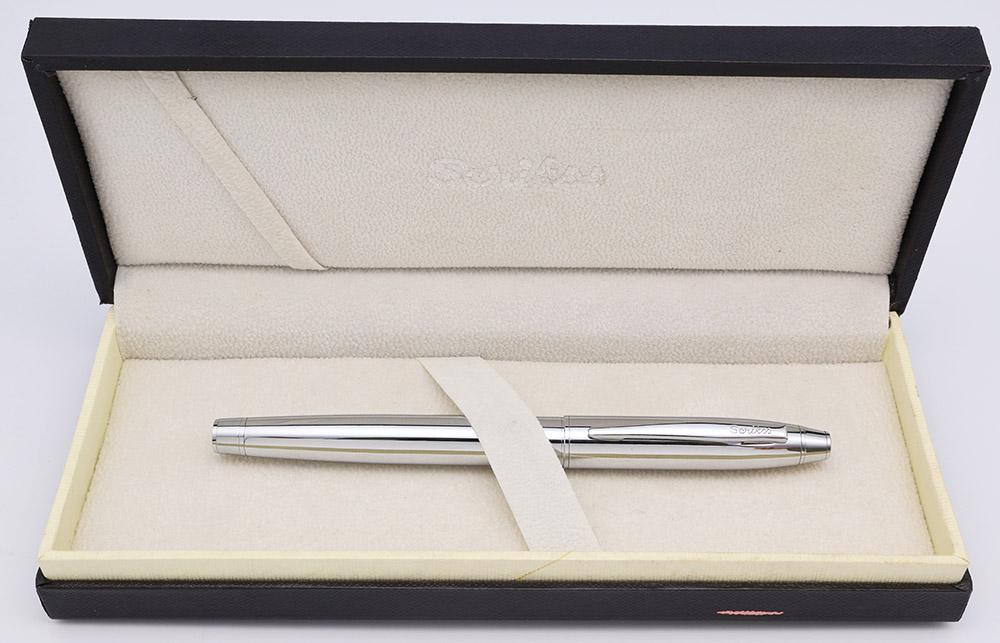 Condition Near mint condition, in box, and with no cracks, chips, dents, or dings. This is a nice sized pen with mirror-like shine and with nice weighting. The cap and barrel have light microscratching. The clip looks great. The imprint is clear.