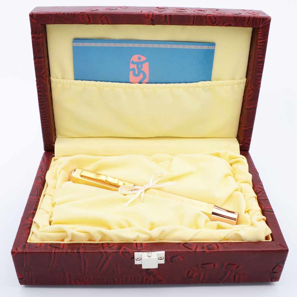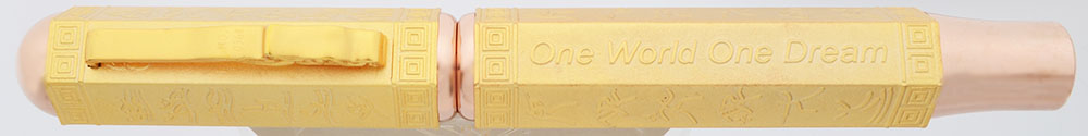 Color Gold colored, with lots of embossed details. Some parts of the trim are copper colored. Pictograms of various sports, the phrase "One World One Dream" in English are featured. Most of the finish has a matte texture to it, but both ends are highly polished.